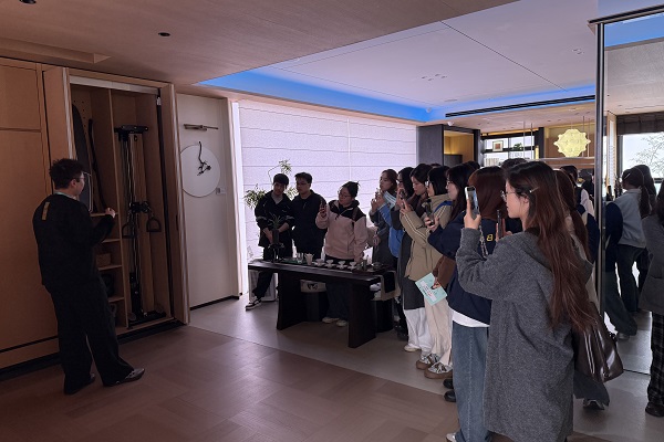 自由参观环节,同学们根据自身专业兴趣与学习需求,在各个功能展区前驻足观摩、交流探讨,亲身感受适老化、适幼化空间等全龄化友好空间的人性化设计细节,主动向展区工作人员请教技术原理与实践应用问题,现场学习氛围热烈浓厚。“从茶室到客房的灵活转换,这个可变空间的设计太巧妙了,完全兼顾了实用性与美观性!”一位同学在参观体验后兴奋地分享自己的感悟。